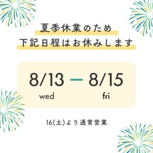 拝啓 時下益々ご清栄のこととお慶び申し上げます。 平素は格別のお引き立てを賜り、厚く御礼申し上げます。 さて、甚だ勝手ながらLIEN鎌倉店及び辻堂店は、8月13日から8月15日まで、夏季休業(お盆休み)とさせていただきます。休業期間中は、お客さまには何かとご不便をお掛けいたしますが、何卒ご寛容くださいますようお願い申し上げます。今後ともなお一層のご愛顧のほどよろしくお願い申し上げます。敬具 シェアする